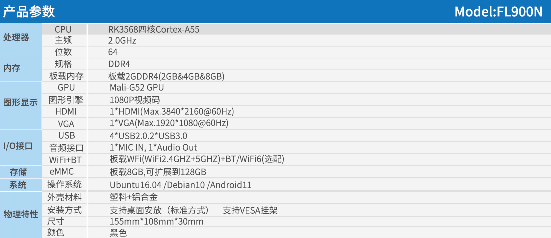 1.采用RK3568四核Cortex-A55处理器 2.板载2G DDR4(2GB&4GB) 3.1*HDMI,1*VGA双视频接口输出; 4.板载8GBeMMC(8GB&16GB&32GB&64GB); 5.2*USB3.0,4*USB2.0; 6.1*RJ45(千兆),板载WiFi模块,WiFi支持2.4G/5G/WiFi6; 7.支持RDP8.0/8.1/10.0-10.6